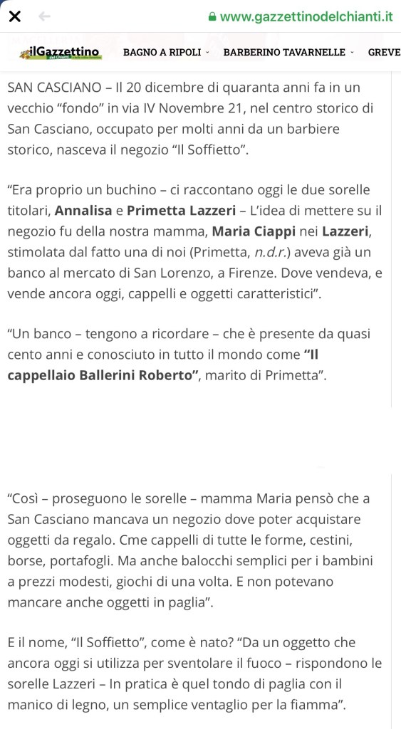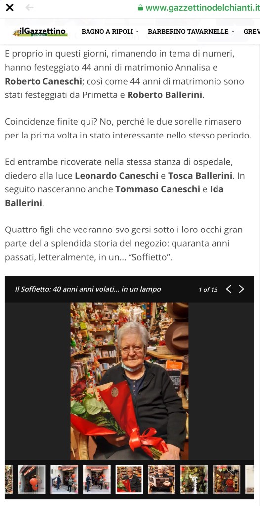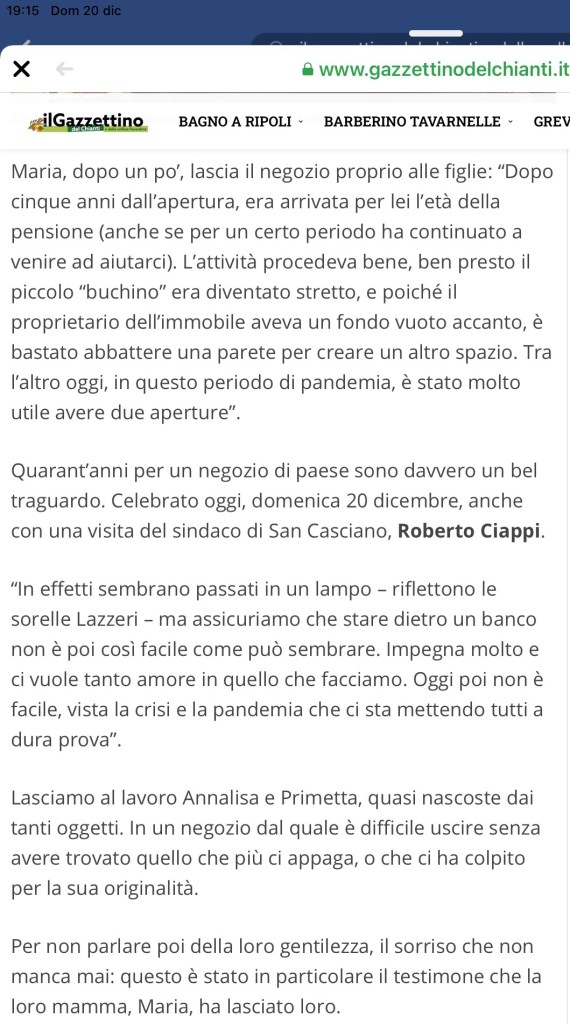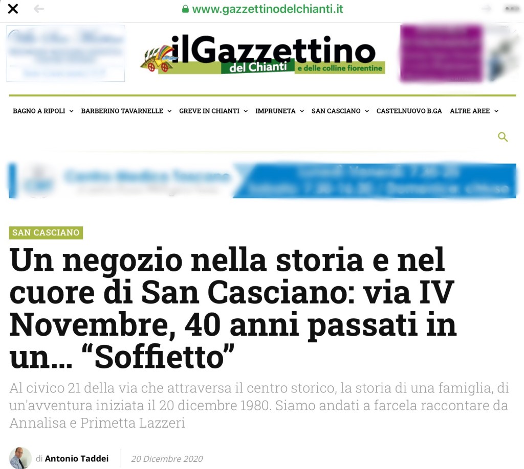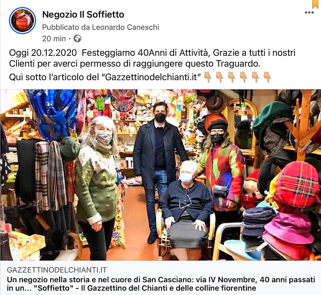 Oggi 20.12.2020 40Anni di attività ilsoffietto / 20/12/2020 Negozio Storico di San Casciano in Val di Pesa(Fi) Grazie a tutti i nostri Clienti! L’articolo del Gazzettino del Chianti, con la presenza del Sindaco. Condividi: Condividi su X (Si apre in una nuova finestra) X Condividi su Facebook (Si apre in una nuova finestra) Facebook Mi piace Caricamento...